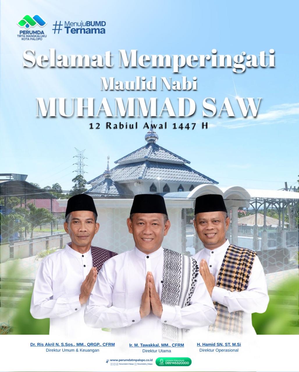Direksi Perumda Tirta Mangkaluku Kota Palopo: Selamat Memperingati Maulid Nabi Muhammad SAW, 12 Rabiul Awal 1447 H.adminSeptember 4, 2025September 4, 2025Uncategorized2306 Dilihat Post Views: 2,306 Jangan LewatkanDireksi Perumda Tirta Mangkaluku Kota Palopo Mengucapkan: Selamat Memperingati Hari Kesaktian Pancasila 2025Debit Sumber Air Baku PDAM di Latuppa dan Mangkaluku Menurun, Perumda TM Palopo Kerahkan 5 Unit Mobil TangkiPipa Jaringan PDAM di Jalan Memet Alami Kebocoran, Pelayanan Distribusi Air TergangguPemkab dan Forkopimda Sepakat Dukung Kepastian Hukum dan Percepatan Investasi di Kabupaten LuwuPenggantian Pipa PDAM di Jalan Tenriadjeng Kota Palopo SelesaiPerumda Tirta Mangkaluku Kota Palopo Gelar Workshop Zona Integritas
