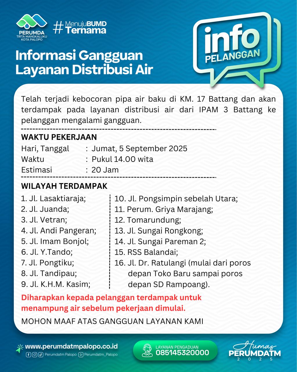Humas Perumda Tirta Mangkaluku Kota Palopo menginformasikan, bahwa telah terjadi kebocoran pipa distribusi air baku di kilometer 17 Battang. Akibatnya pelayanan distribusi air bersih ke pelanggan dari IPAM 3 Battang mengalami gangguan.