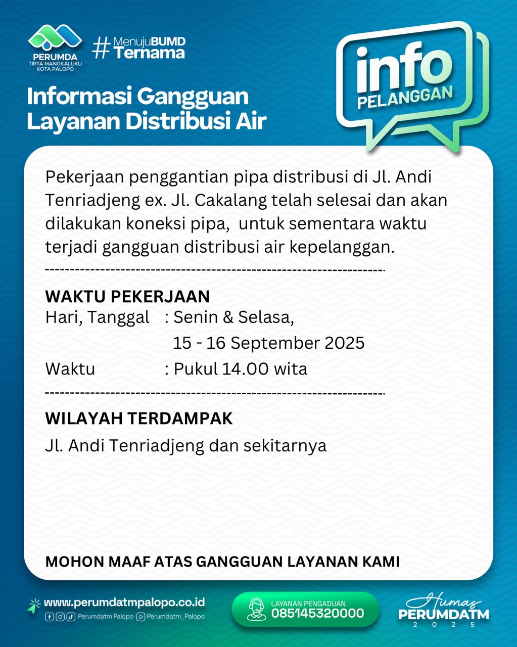 Relis Humas Perumda Tirta Mangkaluku Kota Palopo menginformasikan bahwa pekerjaan penggantian pipa distribusi di Jalan Tenriadjeng ex Jalan Cakalang dinyatakan sudah selesai. Selanjutnya akan dilakukan koneksi ke pipa distribusi yang menghubungkan ke rumah-rumah pelanggan.