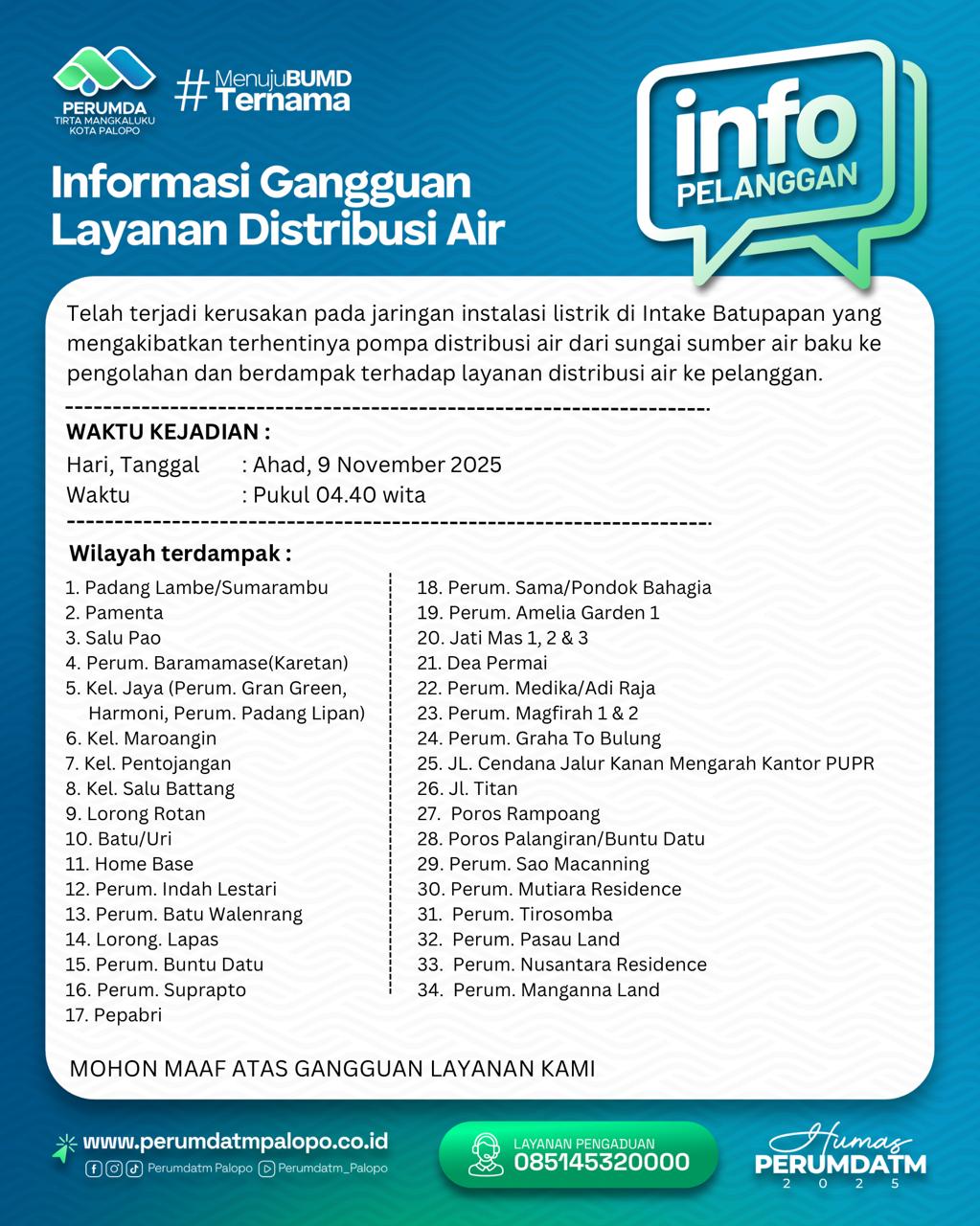 Diinformasikan oleh Humas Perumda Tirta Mangkaluku Kota Palopo, bahwa telah terjadi kerusakan instalasi listrik di intake Batupapan. Atas terjadinya kerusakan ini mengakibatkan tidak berfungsinya pompa distribusi air dari sumber air baku ke pengolahan. Dengan demikian distribusi pelayanan air ke pelanggan menjadi terganggu.